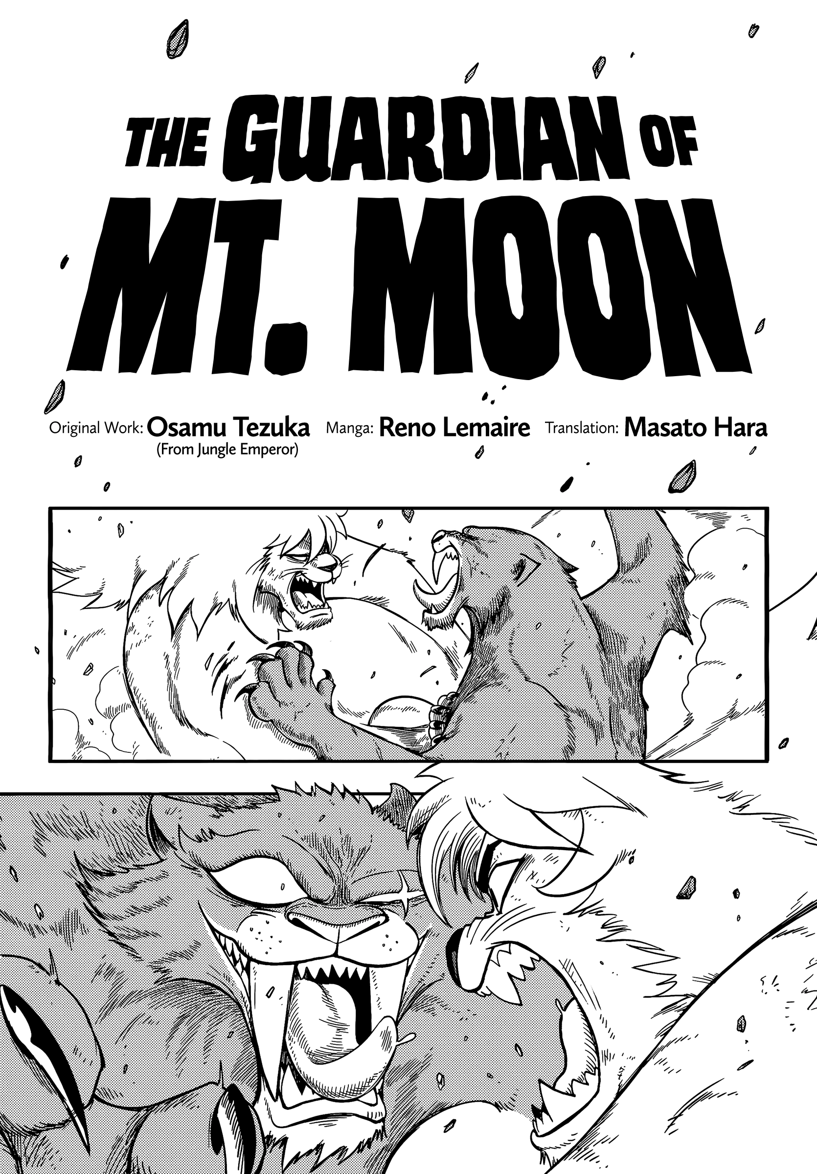 The Guardian of Mt. Moon (ムーン山の守護者 Mūn yama no gādian) is a doujinshi of the Jungle Emperor universe by French artist Reno Lamaire. Pre-published in Vol. 3 of the Tezuka tribute magazine, "TezuComi" on December 5, 2018, this one-shot story revolves around the mysterious Mt. Moon.